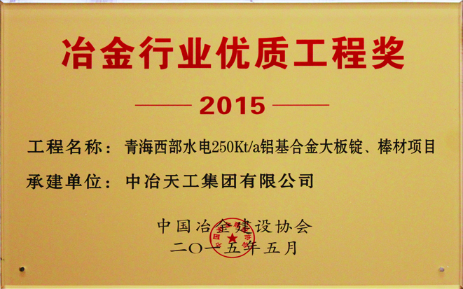 2015年度全国冶金行业优质工程奖-青海西部水电250Kta铝基合金大板锭、棒材项目