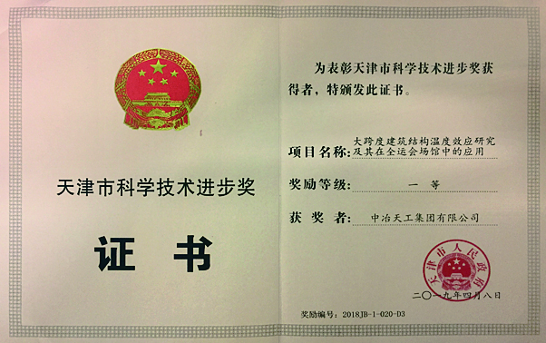 天津市科学技术进步一等奖-大跨度建筑结构温度效应研究及其在全运会场馆中的应用