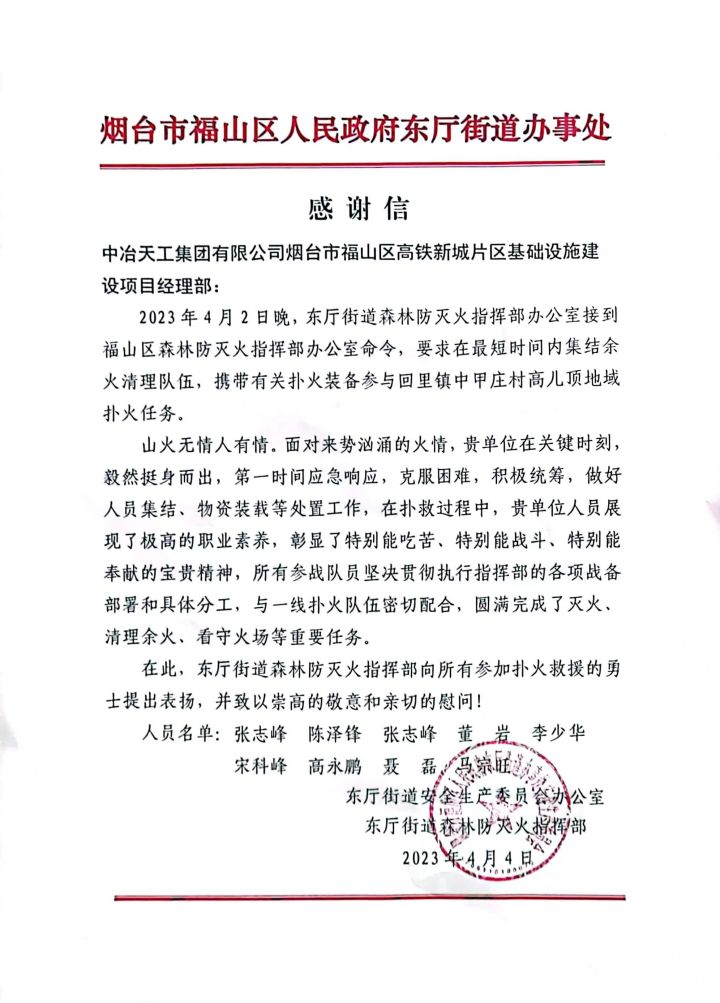 4月6日,渤海公司煙臺(tái)市福山區(qū)高鐵新城片區(qū)基礎(chǔ)設(shè)施建設(shè)項(xiàng)目部收到煙臺(tái)市福山區(qū)人民政府東廳街道送來的感謝信,對(duì)項(xiàng)目部聞令而動(dòng)、迅速集結(jié)、趕赴現(xiàn)場(chǎng),開展滅火救援行動(dòng)表示感謝。