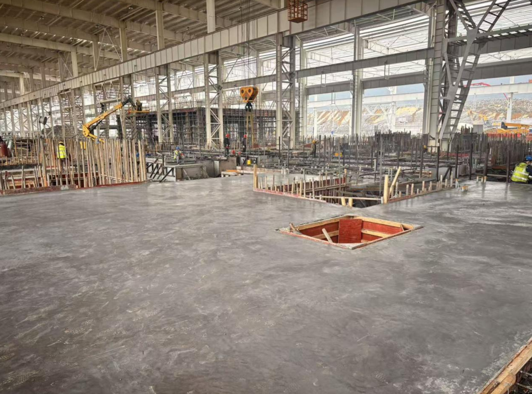 該項(xiàng)目為重慶市2025年重大項(xiàng)目之一,主要建設(shè)熱軋冷軋聯(lián)合車(chē)間、智能物流裝置等。本次澆筑工程混凝土總體積達(dá)4100立方米,最厚處達(dá)5米,施工強(qiáng)度與質(zhì)量管控要求極高。為保障作業(yè)順利推進(jìn),項(xiàng)目部提前謀劃、精密部署,牽頭組織業(yè)主、監(jiān)理、分包及混凝土供應(yīng)商等多方單位召開(kāi)技術(shù)交底會(huì)議,全鏈條梳理供應(yīng)保障、過(guò)程控制、澆筑工藝、路徑規(guī)劃等關(guān)鍵工作,制定詳實(shí)管控方案與完備應(yīng)急預(yù)案。