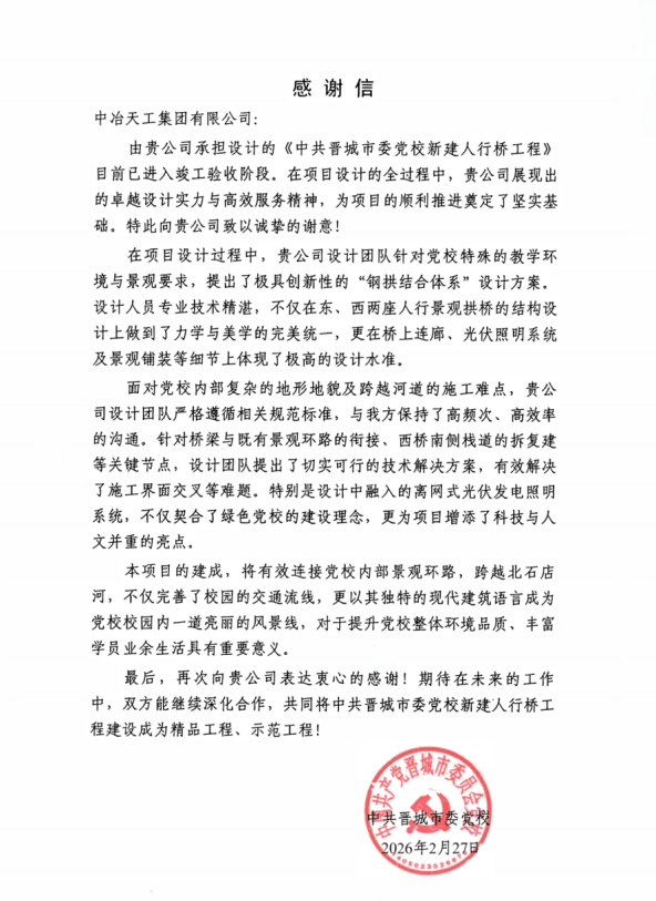 近日,工程技術(shù)總院中共晉城市委黨校新建人行橋工程設(shè)計(jì)項(xiàng)目收到業(yè)主發(fā)來的感謝信。信中,業(yè)主單位對(duì)設(shè)計(jì)團(tuán)隊(duì)的高品質(zhì)服務(wù)給予高度評(píng)價(jià)。