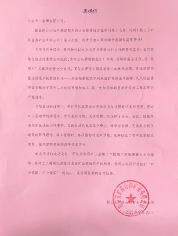 信中,鞍山五礦陳臺溝礦業(yè)有限公司對中冶天工在項(xiàng)目建設(shè)過程中的責(zé)任擔(dān)當(dāng)與協(xié)同意識表示衷心感謝,充分肯定了項(xiàng)目團(tuán)隊(duì)在面臨施工過程中的特殊需求、高精度技術(shù)標(biāo)準(zhǔn)等諸多挑戰(zhàn)中,所展現(xiàn)出的勇于攻堅(jiān)、科學(xué)統(tǒng)籌的能力和擔(dān)當(dāng)。無論是關(guān)鍵節(jié)點(diǎn)的高效溝通,還是細(xì)節(jié)問題的耐心協(xié)同,都為項(xiàng)目順利推進(jìn)奠定了堅(jiān)實(shí)基礎(chǔ)。