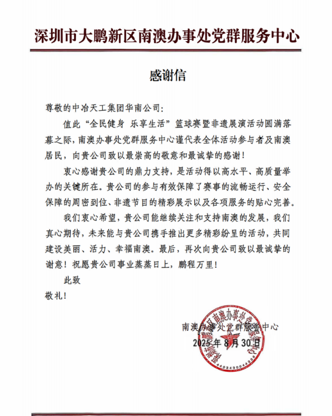 8月30日,華南公司收到深圳市大鵬新區(qū)南澳辦事處黨群服務(wù)中心發(fā)來的感謝信,信中對(duì)華南公司在“全民健身 樂享生活”籃球賽暨非遺展演活動(dòng)中給予的大力支持表示誠(chéng)摯感謝,高度肯定了華南公司為活動(dòng)高水平、高質(zhì)量舉辦所作出的貢獻(xiàn)。