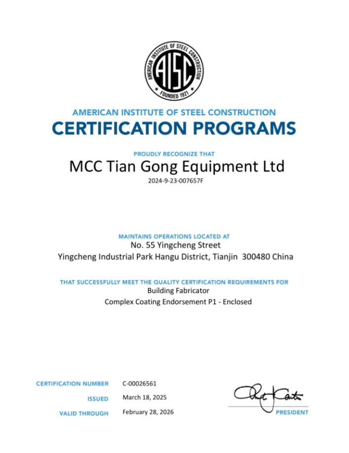 AISC認(rèn)證是美國(guó)鋼結(jié)構(gòu)協(xié)會(huì)針對(duì)鋼結(jié)構(gòu)制造工廠的質(zhì)量管理體系認(rèn)證,旨在確保企業(yè)具備符合北美市場(chǎng)要求的技術(shù)能力和管理規(guī)范。審核組先后審查了材料庫(kù)及廠區(qū)的各工位,并對(duì)材料管理、材料追溯、焊接工藝油漆工藝等生產(chǎn)過程控制進(jìn)行了現(xiàn)場(chǎng)審核,其中對(duì)現(xiàn)場(chǎng)構(gòu)件的追溯、油漆工理論及操作、焊工理論及操作、焊接預(yù)熱記錄、焊縫外觀及尺寸等進(jìn)行了隨機(jī)的抽樣檢查,抽樣結(jié)果完全符合AISC程序文件和工藝要求。隨后,審核員對(duì)公司的質(zhì)量手冊(cè)、程序文件以及過程控制文件資料進(jìn)行了認(rèn)真審核。