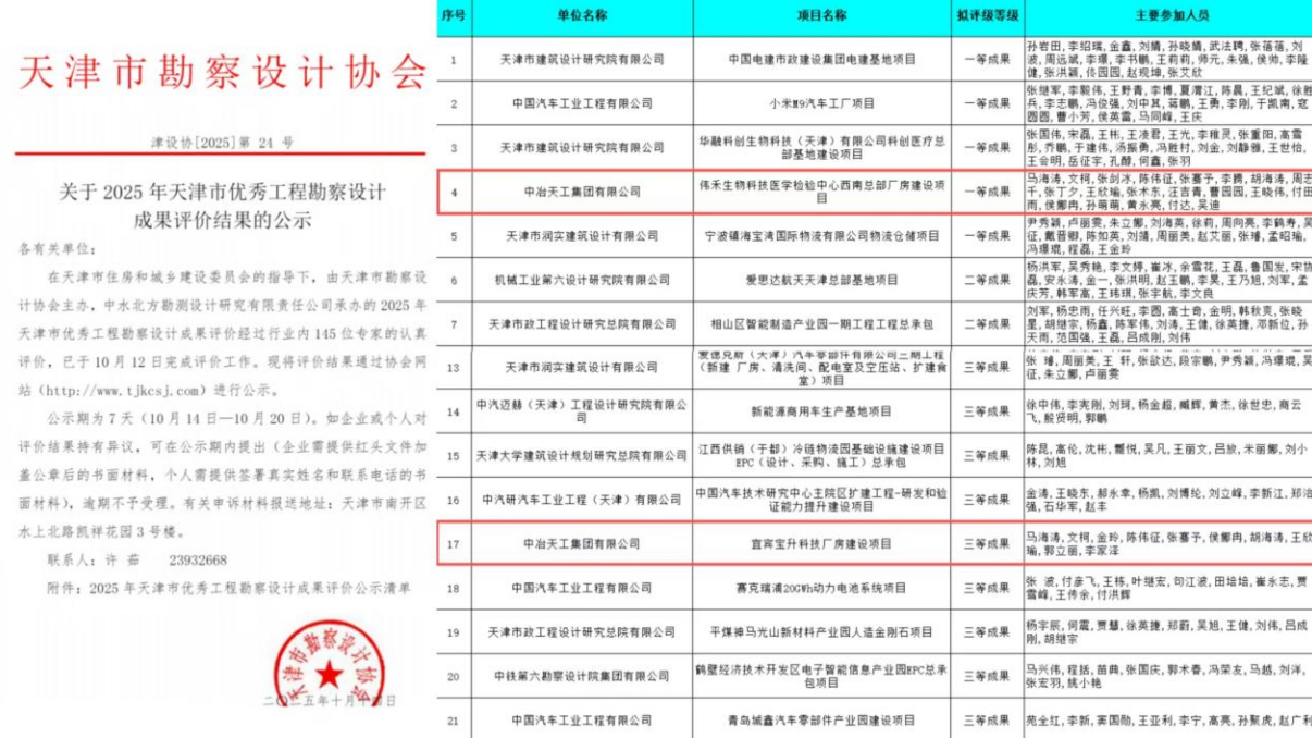 近日,2025年度“海河杯”天津市優(yōu)秀工程勘察設(shè)計(jì)獎(jiǎng)評選結(jié)果揭曉,中冶天工兩個(gè)項(xiàng)目喜獲佳績,為“天工設(shè)計(jì)”榮譽(yù)簿再添新彩。其中偉禾生物科技醫(yī)學(xué)檢驗(yàn)中心西南總部廠房建設(shè)項(xiàng)目獲得建筑工程(工業(yè)建筑)類一等獎(jiǎng),宜賓寶升科技廠房建設(shè)項(xiàng)目獲得建筑工程(工業(yè)建筑)類三等獎(jiǎng)。