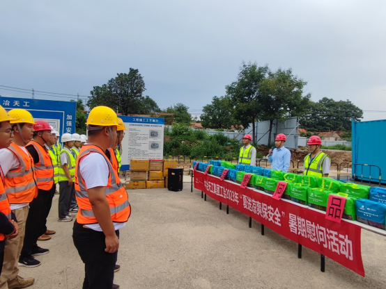 集團(tuán)公司工會(huì)為一線員工準(zhǔn)備了防暑降溫“涼爽”慰問(wèn)品,慰問(wèn)代表叮囑大家在炎熱夏季要做好個(gè)人防護(hù)、保護(hù)好自身健康安全,項(xiàng)目管理團(tuán)隊(duì)要重視防暑降溫工作,合理安排錯(cuò)峰戶外作業(yè)時(shí)間,采用輪班作業(yè)等,做好警示提醒,確保平安度夏。