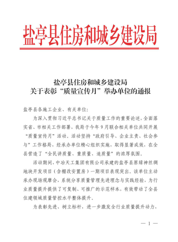 近日,南方公司承建的四川省綿陽市鹽亭縣原綠神絲綢地塊開發(fā)項目憑借卓越的質(zhì)量管理成效、創(chuàng)新的實踐經(jīng)驗及廣泛的行業(yè)示范作用,榮獲鹽亭縣住房和城鄉(xiāng)建設(shè)局通報表彰。