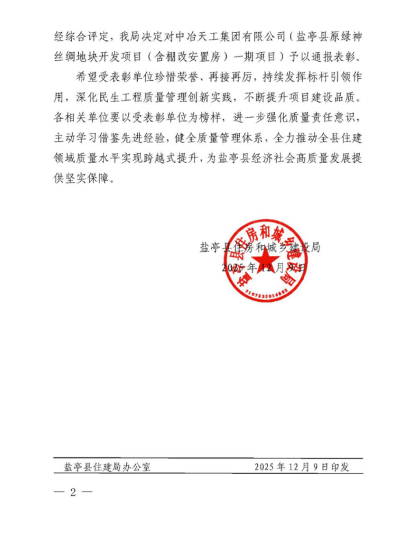 榮譽在肩,責(zé)任在身。項目部將以此次通報表彰為契機,再接再厲、精益求精,持續(xù)發(fā)揮標(biāo)桿引領(lǐng)作用,深化民生工程質(zhì)量管理創(chuàng)新實踐,不斷提升項目建設(shè)品質(zhì)。同時,將積極分享質(zhì)量管理經(jīng)驗,與行業(yè)同仁攜手共進,助力屬地住建領(lǐng)域質(zhì)量管控水平有效提升,以實際行動踐行企業(yè)社會責(zé)任,為鹽亭縣經(jīng)濟社會高質(zhì)量發(fā)展貢獻“天工力量”!