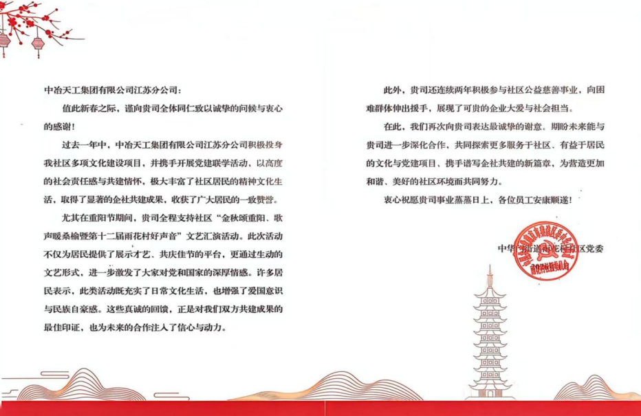 中原公司江蘇分公司表示,服務(wù)社區(qū)是央企黨組織的重要責(zé)任。下一步,公司將繼續(xù)以黨建為引領(lǐng),深化與雨花村社區(qū)的共建合作,拓展服務(wù)領(lǐng)域,切實(shí)解決居民急難愁盼問(wèn)題,與社區(qū)攜手提升基層治理水平。