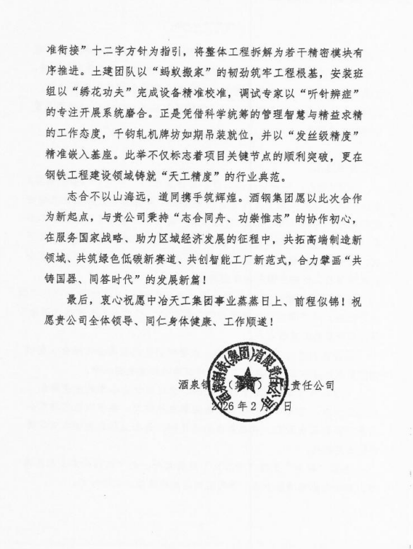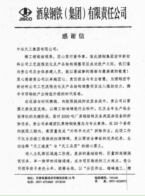 近日,工業(yè)工程公司甘肅酒鋼宏宇新材料工藝流程優(yōu)化及產(chǎn)品結(jié)構(gòu)調(diào)整項(xiàng)目收到酒鋼集團(tuán)感謝信。信中對(duì)項(xiàng)目的成功投產(chǎn)給予高度評(píng)價(jià),對(duì)公司展現(xiàn)的卓越匠心、責(zé)任擔(dān)當(dāng)與專業(yè)智慧致以最誠摯的感謝與最崇高的敬意。