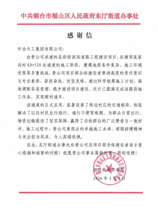 2月3日,渤海公司煙臺市福山區(qū)縣府街西延道路工程項(xiàng)目部收到東廳街道辦事處發(fā)來的感謝信,對項(xiàng)目部在縣府街西延道路工程K0+520處通道施工中展現(xiàn)出的卓越組織能力和攻堅(jiān)精神表示高度贊揚(yáng)與誠摯感謝。