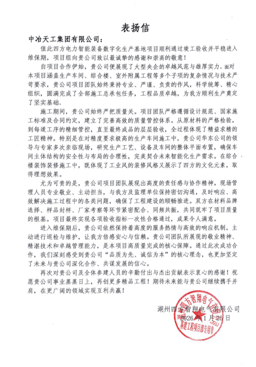 近日,中原公司浙江湖州四方電力智能裝備數(shù)字化生產(chǎn)基地項(xiàng)目收到了業(yè)主發(fā)來(lái)的表?yè)P(yáng)信。信中對(duì)項(xiàng)目團(tuán)隊(duì)秉持專(zhuān)業(yè)嚴(yán)謹(jǐn)、務(wù)實(shí)擔(dān)當(dāng)?shù)墓ぷ髯黠L(fēng),以精益求精的匠心圓滿完成施工任務(wù),并推動(dòng)項(xiàng)目平穩(wěn)進(jìn)入維保階段表達(dá)了真摯的感謝。