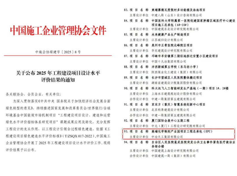 近日,中國施工企業(yè)管理協(xié)會公布了2025年工程建設(shè)項目設(shè)計水平評價結(jié)果,中冶天工承建的高端化學(xué)制劑產(chǎn)業(yè)園項目憑借卓越的設(shè)計實力脫穎而出,榮獲三等成果。此次獲獎,再次展現(xiàn)了中冶天工在規(guī)劃設(shè)計領(lǐng)域的技術(shù)優(yōu)勢與綜合能力,進(jìn)一步提升了“天工設(shè)計”品牌的知名度與行業(yè)影響力,為企業(yè)高質(zhì)量發(fā)展注入了堅實的業(yè)績支撐與榮譽動能。